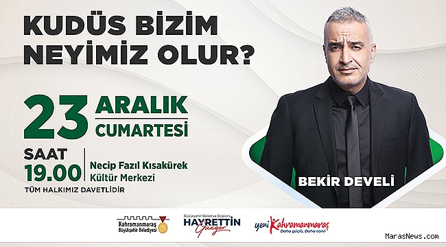 Şiir ve edebiyatın başkentinde kültür sanat faaliyetlerini kesintisiz sürdüren Kahramanmaraş Büyükşehir Belediyesi, ekranların sevilen ismi Yazar Bekir Develi’yi kültür sanat dostlarıyla buluşturacak. Kaleme aldığı eserler ve konferanslarıyla binlerce kişinin hayatına dokunan Yazar Bekir Develi, 23 Aralık Cumartesi günü Necip Fazıl Kısakürek Kültür Merkezi’nde ‘Kudüs Bizim Neyimiz Olur?’ temalı konferansta Kahramanmaraşlılara seslenecek. Saat 19.00’da başlayacak etkinlikte Develi, Kudüs’ün İslam coğrafyası için önemine değinecek. Büyükşehir Belediyesinden yapılan açıklamada, ücretsiz olarak gerçekleştirilecek konferansa tüm vatandaşların davetli olduğu belirtildi.