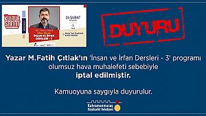 Kahramanmaraş Büyükşehir Belediyesi, Şubat Kültür Sanat Etkinlikleri kapsamında 24 Şubat Perşembe günü (bugün) saat 18.00’da Necip Fazıl Kısakürek Kültür Merkezi’nde düzenlenmesi planlanan İlahiyatçı – Yazar M. Fatih Çıtlak konferansının olumsuz hava koşulları nedeniyle ileri bir tarihe ertelendiğini duyurdu. Kültür Spor ve Turizm Dairesi Başkanlığı’ndan ertelenen etkinliğe ilişkin yapılan açıklamada, “Yaşanan hava muhalefeti nedeniyle bugün saat 18.00’da düzenlenmesi planlanan Yazar Fatih Çıtlak konferansı ileri bir tarihte gerçekleştirilmek üzere iptal olmuştur” ifadelerine yer verildi.