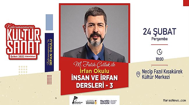 Kahramanmaraş Büyükşehir Belediyesi tarafından düzenlenen Şubat Kültür Sanat Etkinlikleri kapsamında alanında uzman konuklar Kahramanmaraşlılarla buluşmaya devam ediyor. Bu kapsamda, 24 Şubat Perşembe günü (yarın) İlahiyatçı – Yazar M. Fatih Çıtlak konferansı düzenlenecek. Necip Fazıl Kısakürek Kültür Merkezi’nde saat 18.00’da başlayacak olan etkinlikte Yazar M. Fatih Çıtlak, ‘İnsan ve İrfan Dersleri’ konusunu farklı açılardan ele alacak.