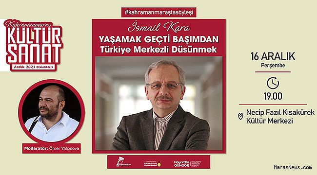 Kahramanmaraş Büyükşehir Belediyesi tarafından düzenlenen Aralık Kültür Sanat Etkinlikleri hız kesmeden sürüyor. Takvim kapsamında, 16 Aralık Perşembe günü (yarın) saat 19.00’da Necip Fazıl Kısakürek Kültür Merkezi’nde birçok araştırma kitabında imzası bulunan İlahiyatçı – Yazar İsmail Kara ile söyleşi programı gerçekleştirilecek. Modaratörlüğünü Ömer Yalçınova’nın üstlendiği programda, “Türkiye Merkezli Düşünmek” başlığı masaya yatırılacak. Kültür Spor ve Turizm Dairesi Başkanlığı’ndan yapılan açıklamada, etkinliğe tüm vatandaşların davet edildiği bildirildi.