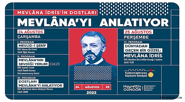Kahramanmaraş Büyükşehir Belediyesi, anlamlı bir etkinliğe daha ev sahipliği yapıyor. Bu kapsamda, Haziran ayında hayatını kaybeden Kahramanmaraşlı Şair - Yazar Mevlâna İdris Zengin’in dostlarının katılımıyla “Mevlâna İdris’i Anma Programı” gerçekleştirilecek. 24 Ağustos Çarşamba günü Ulu Cami’de öğle namazında okunacak Mevlid – i Şerif’le başlayacak program, Acemli Cami’nde kılınacak ikindi namazının ardından Mevlana İdris’in sevdiği yerlere düzenlenecek gezi etkinliğiyle devam edecek. Anma programı çerçevesinde Yedi Güzel Adam Edebiyat Müzesi’nde saat 20.00’de “Dostları Mevlâna’yı Anlatıyor” temalı etkinlik de gerçekleştirilecek. Mevlâna İdris’i Anma Programı, 25 Ağustos Perşembe günü saat 11.30’da Andırın Mevlâna İdris Millet Konağı’nda gerçekleştirilecek “Dünyadan Geçen Bir Güzel: Mevlâna İdris” temalı etkinlikle noktalanacak. Büyükşehir Belediyesi’nden yapılan açıklamada, Mevlâna İdris’i Anma Programı’na tüm Kahramanmaraşlıların davetli olduğu belirtildi.