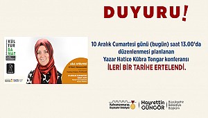 Kahramanmaraş Büyükşehir Belediyesi, Sezai Karakoç Kültür Sanat Sezonu kapsamında 10 Aralık Cumartesi günü (bugün) saat 13.00’da düzenlenmesi planlanan Yazar Hatice Kübra Tongar ile ‘Fıtrat Pedagojisi’ etkinliğinin ileri bir tarihe ertelendiği duyurdu. Yapılan açıklamada, “10 Aralık Cumartesi günü Necip Fazıl Kısakürek Kültür Merkezi’nde düzenlenmesi planlanan Aile Atölyesi etkinliğimiz, Yazar Hatice Kübra Tongar’ın yaşamış olduğu rahatsızlık nedeniyle ileri bir tarihe ertelenmiştir” ifadelerine yer verildi.