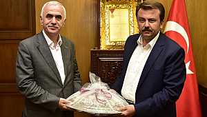 Başkan Erkoç ziyaretin anısına Genel Başkan Yardımcısı ve Yerel Yönetimler Başkanı Kaya’ya Maraş işi bakır tabak hediye etti.