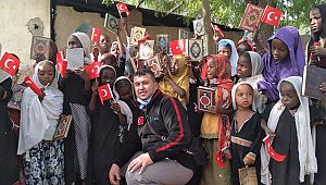 Sureleri tahta levhalara yazarak hafız olmak isteyen yetimlere bağış yapılan Kur’anları tek tek dağıtan Başkan Güney, “Burası yokluklar ülkesi, imkânsızlıklar ülkesi. Afrika’da o kadar misyonerler her yeri kuşatmışken, yetimlerimiz Kur’an Kurslarında sureleri tahta levhalara yazarak hafız olmaya çalışıyorlar. Bizde o yetimlerimize bağış yapılan Kur’an-ı Kerim’leri hediye ediyoruz.” Diye konuştu.