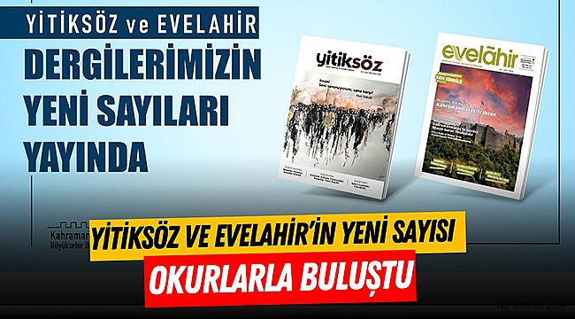 Kahramanmaraş Büyükşehir Belediyesi, şiir ve edebiyatın başkentinde kültür sanata derinlik kazandırmak, sanatsal ve entelektüel birikimi artırmak için faaliyetlerine devam ediyor. Bu kapsamda Büyükşehir Belediyesi, Kültür Yayınları’ndan Yitiksöz ve Evelahir dergilerinin yeni sayılarını okurlarla buluşturdu. Şehrin sanat, edebiyat ve düşünce dergisi olan Yitiksöz’ün yeni sayısında; Cahit Koytak, Suavi Kemal Yazgıç, İnci Okumuş, Osman Bayraktar ve Aliye Uslu Üstten gibi pek çok yazar ve fikir insanının birbirinden değerli yazıları yer alırken, Evelahir dergisinin yeni sayısında; Maraş masalları, Kahramanmaraş’taki tarihi ve doğal güzellikler, 6 Şubat depremlerinin süregelen etkileri gibi pek çok konuya değiniliyor. Büyükşehir Belediyesinden yapılan açıklamada, Yitiksöz ve Evelahir dergilerinin yeni sayısına e-dergi formatında https://kahramanmaras.bel.tr/e-dergi ve https://www.marastaedebiyat.com/belediye-yayinlari internet adreslerinden ücretsiz bir şekilde ulaşılabileceği belirtildi.