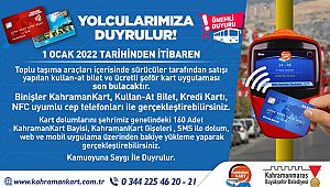 Kahramanmaraş Büyükşehir Belediyesi, 1 Ocak 2022 tarihi itibariyle toplu taşıma araç içinde satılan “Kullan-At Bilet” ve kullanılan “Şoför Kart” uygulamaları rafa kaldırıyor. İlgili tarihte şehir genelindeki 480 toplu taşıma aracında iki ödeme yöntemi yerine, temassız kredi kartları ve cep telefonları kullanılabilecek. Ayrıca; Kahramankart bakiye yüklemeleri cep telefonlarından kısa mesajla, internet üzerinden, online yükleme, KİOSK’lar (Kahramankart Dolum Makineleri) ya da bayiler aracılığıyla yapılmaya devam edecek. Temassız ödemeye açık kart ve cihazlardan NFC teknolojisiyle yapılabilecek ödemeler, tüm Özel Halk ve Belediye otobüslerinde geçerli olacak. Ulaşım Hizmetleri Daire Başkanlığı’ndan yapılan açıklamada, detaylı bilginin 0344 225 46 20 – 21 çağrı hattından ve www.kahramankart.com.tr internet adresinden alınabileceği ifade edildi.